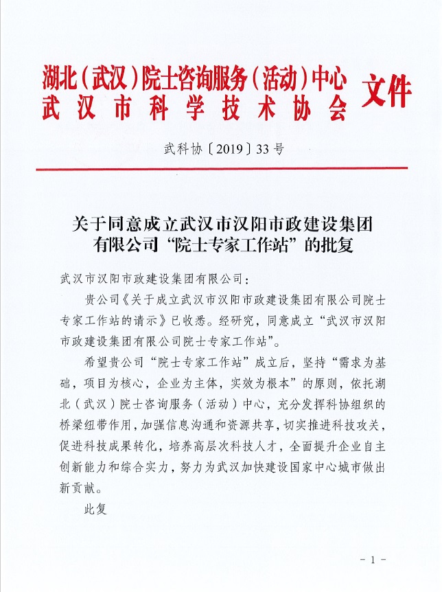 2019520日,湖北(武漢)院士咨詢服務(活動)中心、武漢市科學技術協(xié)會正式批復同意成立武漢市漢陽市政建設集團有限公司院士專家工作站。