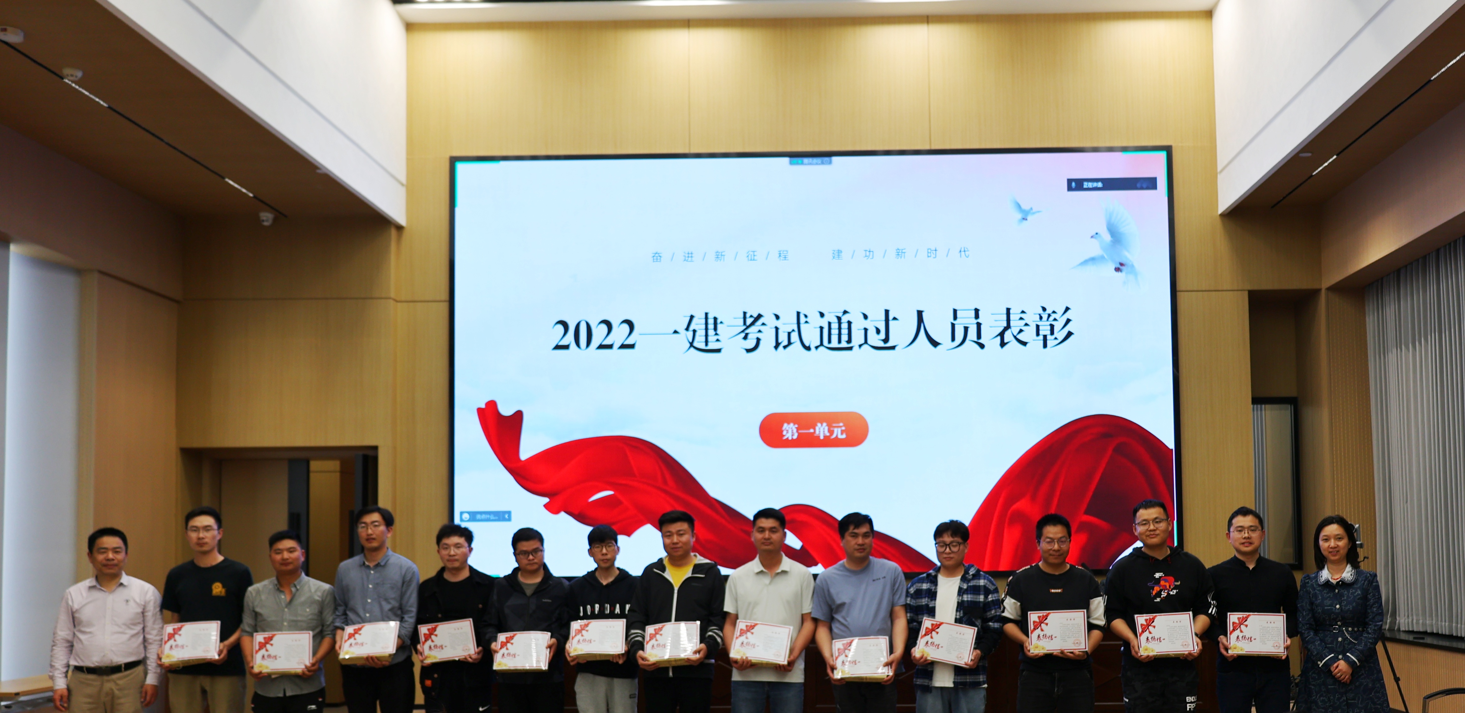 黨委副書記郭一清和本次合作培訓(xùn)機(jī)構(gòu)講師——鑫凌眾教育資深名師甘恢義老師為2022年度16名通過一建考試的學(xué)員頒發(fā)榮譽(yù)獎品和表揚(yáng)信。