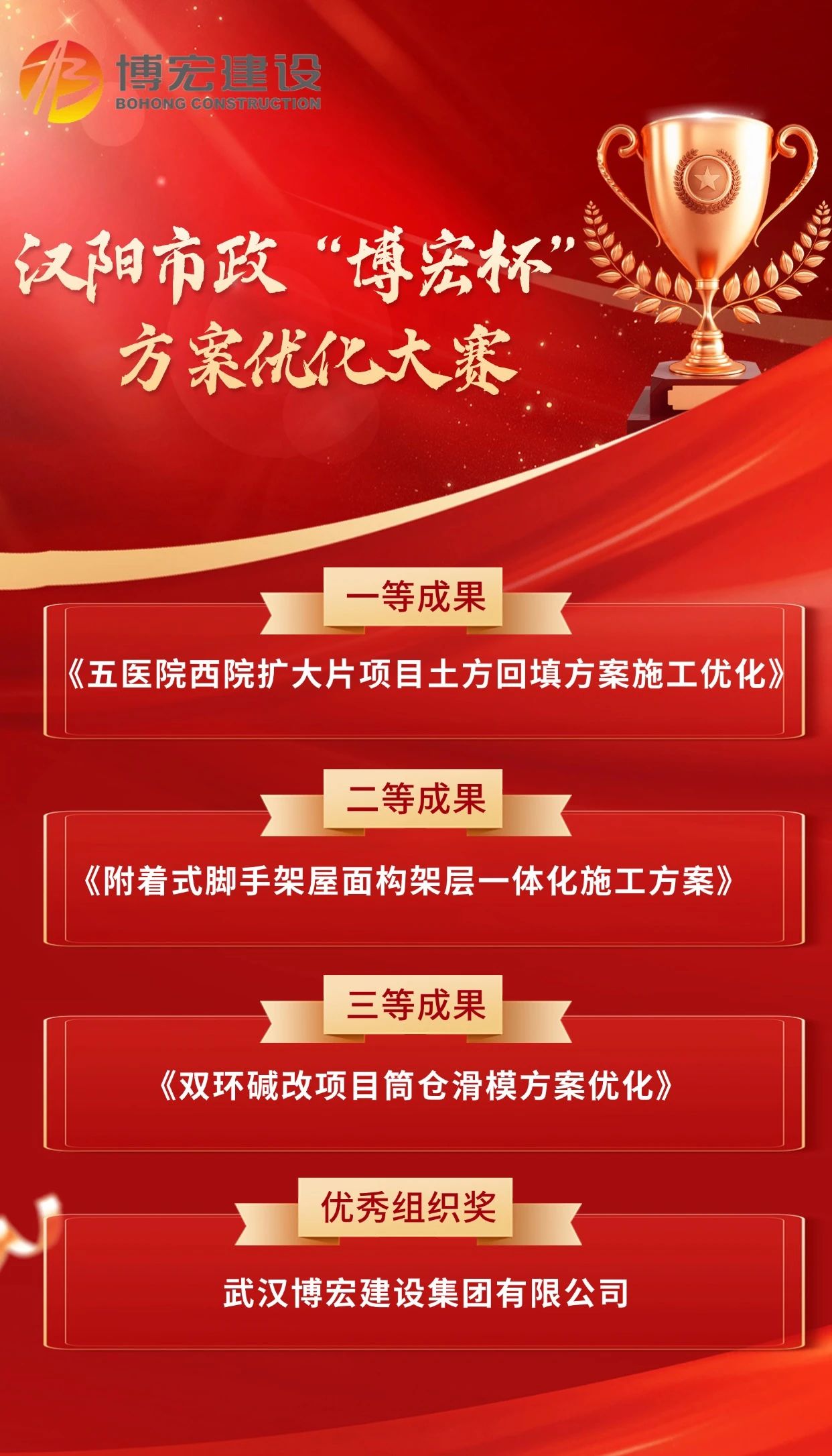 12月24日下午,漢陽(yáng)市政“博宏杯”方案優(yōu)化大賽在漢陽(yáng)市政建設(shè)大廈205會(huì)議室順利舉行,本次比賽以“技術(shù)賦能項(xiàng)目生產(chǎn)”為主題,經(jīng)過(guò)現(xiàn)場(chǎng)匯報(bào)評(píng)選,博宏建設(shè)集團(tuán)斬獲1項(xiàng)一等成果,1項(xiàng)二等成果,1項(xiàng)三等成果,與此同時(shí),公司獲評(píng)優(yōu)秀組織單位。